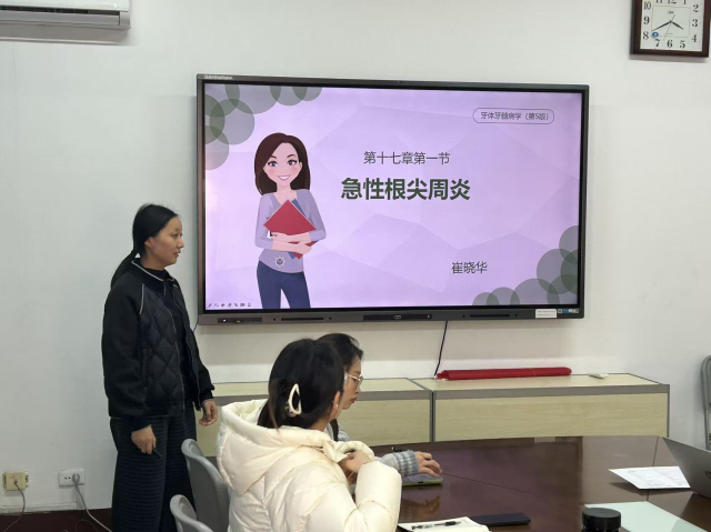 首先,口腔医学教研室崔晓华老师进行了《急性根尖周炎》的讲授,从课程性质、教学目标、疾病特点、临床表现、治疗等方面进行授课。针对教学内容,曹媛媛老师建议发布线上思考题时可增加评分标准,为学生提供更清晰的思考指引,引导学生进行主动思考、主动学习;马帅老师提出课堂语速可适当减慢,助力学生更好地吸收理解课堂知识。