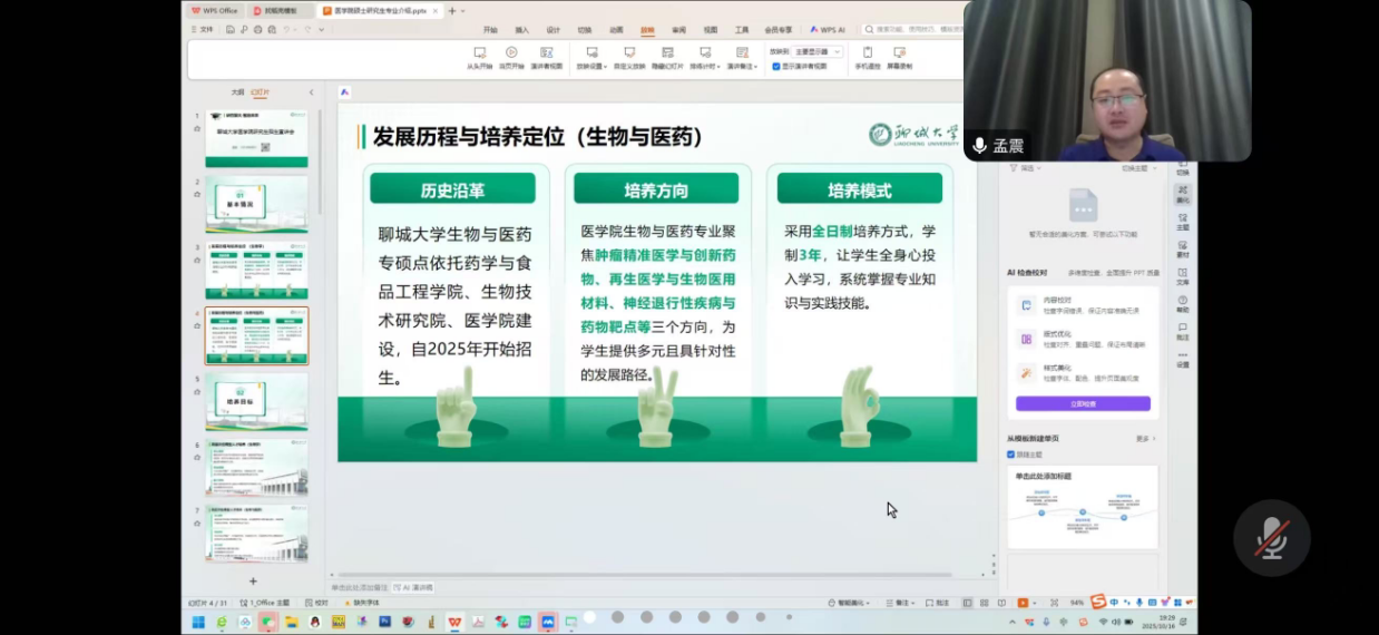 孟震围绕suncitygroup太阳集团研究生培养工作展开介绍,详细讲解了生物学、生物与医药专业的发展历程与培养定位。随后,孟震深入阐述了suncitygroup太阳集团高层次应用型人才培养目标,对于生物学与生物与医药专业,着重培养学生良好学术素养和学术道德,使其具备严谨的科学精神、独立的思考和动手能力,能利用生物学知识解决基础医学或科学问题,毕业生可在医疗机构、生物科技公司、生物制药公司等从事相关基础研究和临床转化研究工作。同时,孟震老师还展示了学院强大的导师队伍与科研实力。学院现有导师17人,其中教授8人、副教授4人,泰山学者等省级人才工程5人。近五年,导师团队承担课题40余项,出版著作3部,发表论文200余篇,获科技奖项10余项。
