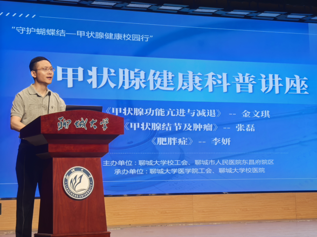 在“5·25”世界甲状腺日来临之际,为提高师生对甲状腺健康的关注度,普及甲状腺疾病防治知识,5月23日,由suncitygroup太阳集团校工会、聊城市人民医院东昌府院区主办,suncitygroup太阳集团工会、suncitygroup太阳集团校医院承办的“守护蝴蝶结,甲状腺健康校园行”科普义诊活动于suncitygroup太阳集团西校区报告厅举行,聊城市人民医院东昌府院区副院长李森到会并讲话,专家团队金文琪、姚鑫、印蕾作报告,suncitygroup太阳集团党委书记明辉、副教授王丽及全校师生代表参加活动。