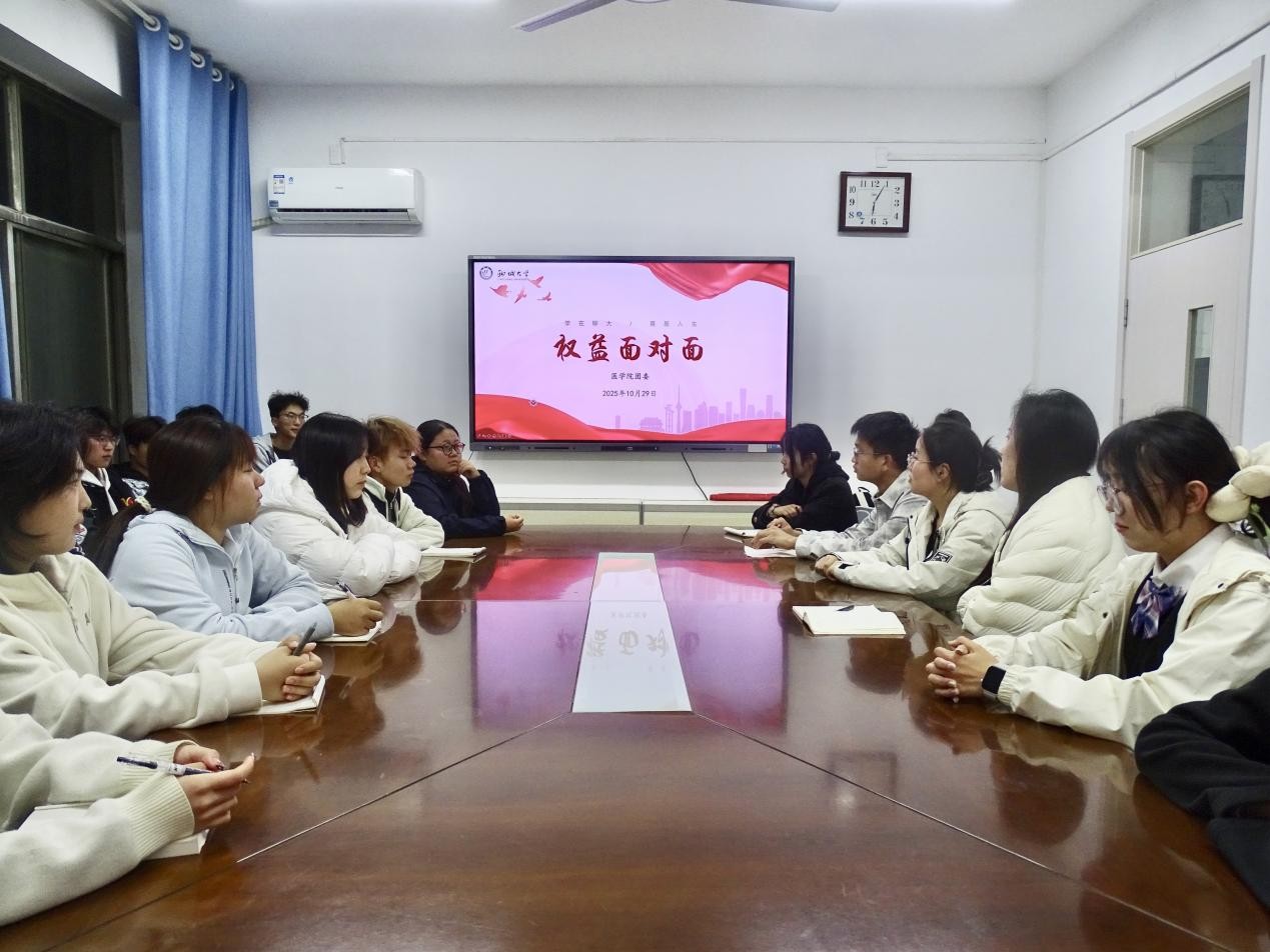 为深入了解学生诉求,切实维护同学权益,营造良好校园环境,10月29日,suncitygroup太阳集团于东一办公楼会议室举办“权益面对面,沟通零距离”主题座谈会.本次座谈会由辅导员史秋波主持,学生会权益服务部及2025级新生代表参加
